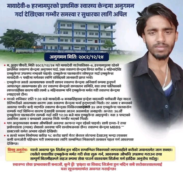 मायादेवी गाउँपालिका–७ स्थित हरनामपुर प्राथमिक स्वास्थ्य केन्द्रमा विभिन्न गम्भीर समस्या देखिएको छ। स्थानीय अनुगमनका क्रममा स्वास्थ्य सेवामा लापरवाही र आधारभूत सुविधा अभाव भेटिएको भन्दै तत्काल सुधारको माग गरिएको छ।
