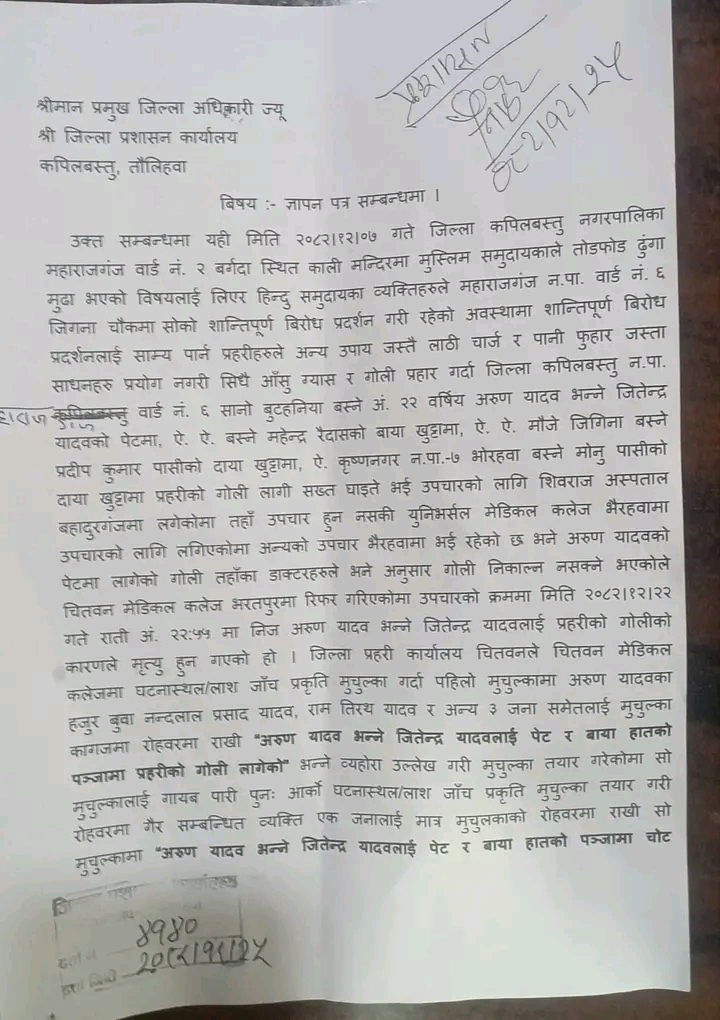 कपिलवस्तु — कपिलवस्तुको महाराजगन्ज नगरपालिका–२ बरगदामा सुरक्षाकर्मीको गोली लागेर घाइते भएका २३ वर्षीय जितेन्द्रभन्ने अरुण यादवको उपचारका क्रममा मृत्यु भएपछि उनका परिवारले क्षतिपूर्ति, राहत र न्यायको माग गरेका छन्।